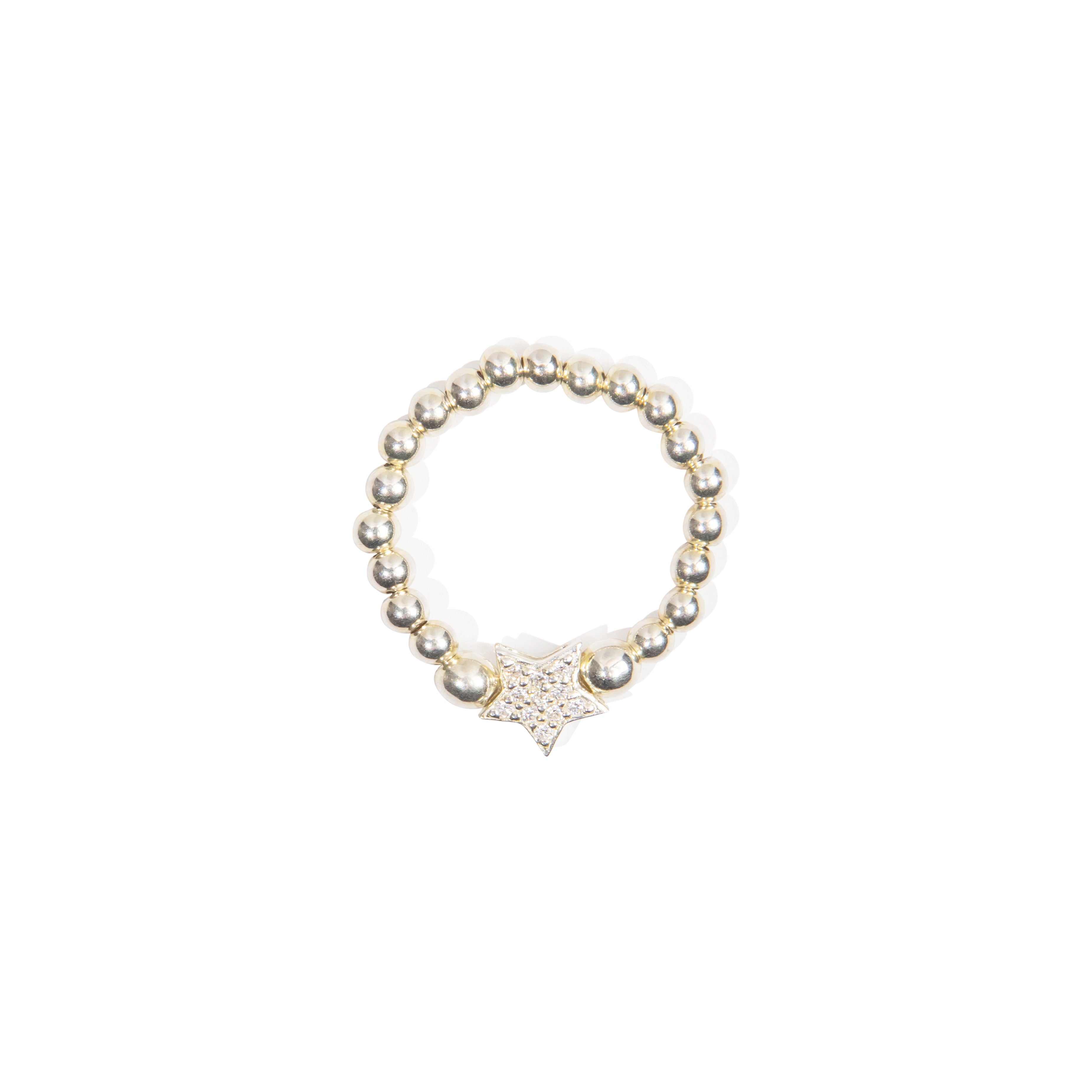 Handmade sterling silver beaded stretch ring with a cubic zirconia star bead charm.