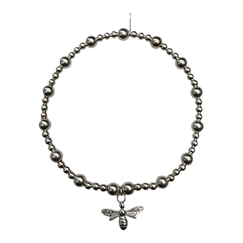 Handmade Sterling Silver beaded stretch bracelet using 3mm and 5mm beads thread onto strong stretch elastic with a sterling silver Bee charm and a 925 Sterling Silver tag.