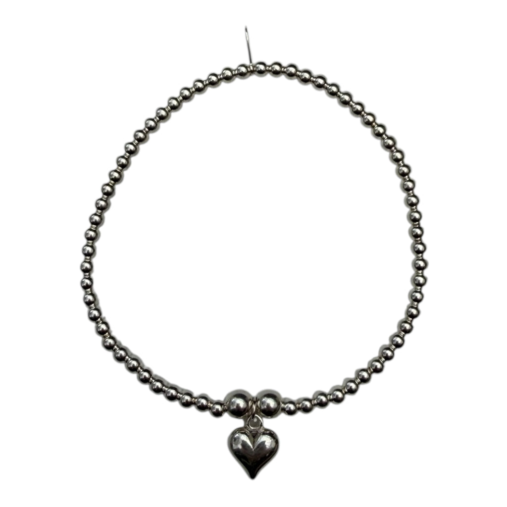 Handmade sterling silver beaded stretch bracelet using 3mm beads thread onto strong stretch elastic with a sterling silver puff Heart charm and a 925 sterling silver tag.