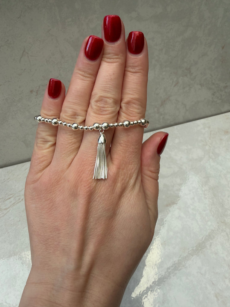 Handmade sterling silver beaded stretch bracelet using 3mm and 5mm beads thread onto strong stretch elastic with a sterling silver Tassel charm and a 925 sterling silver tag.