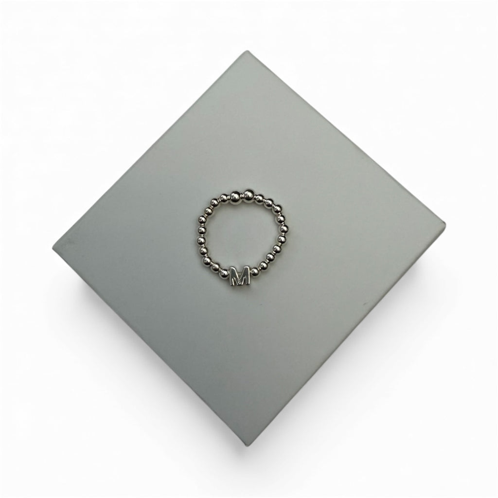 Handmade sterling silver beaded stretch ring using 3mm beads thread onto strong stretch elastic with a sterling silver Initial bead charm.